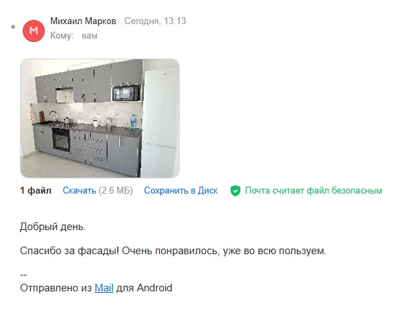 Добрый вечер! Фасады получил и установил. Вашей работой доволен. Качественно сработали. Спасибо.