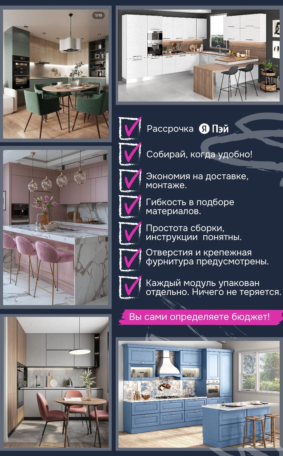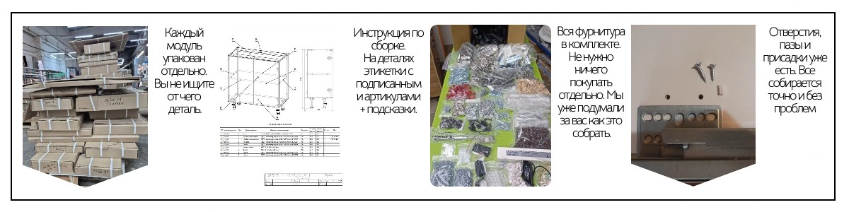 В наборе — все необходимые детали и понятная инструкция. Вы сможете собрать современную и функциональную кухню без вызова мастеров, в удобное именно для вас время и получить удовольствие от процесса. А еще у нас есть рассрочка!